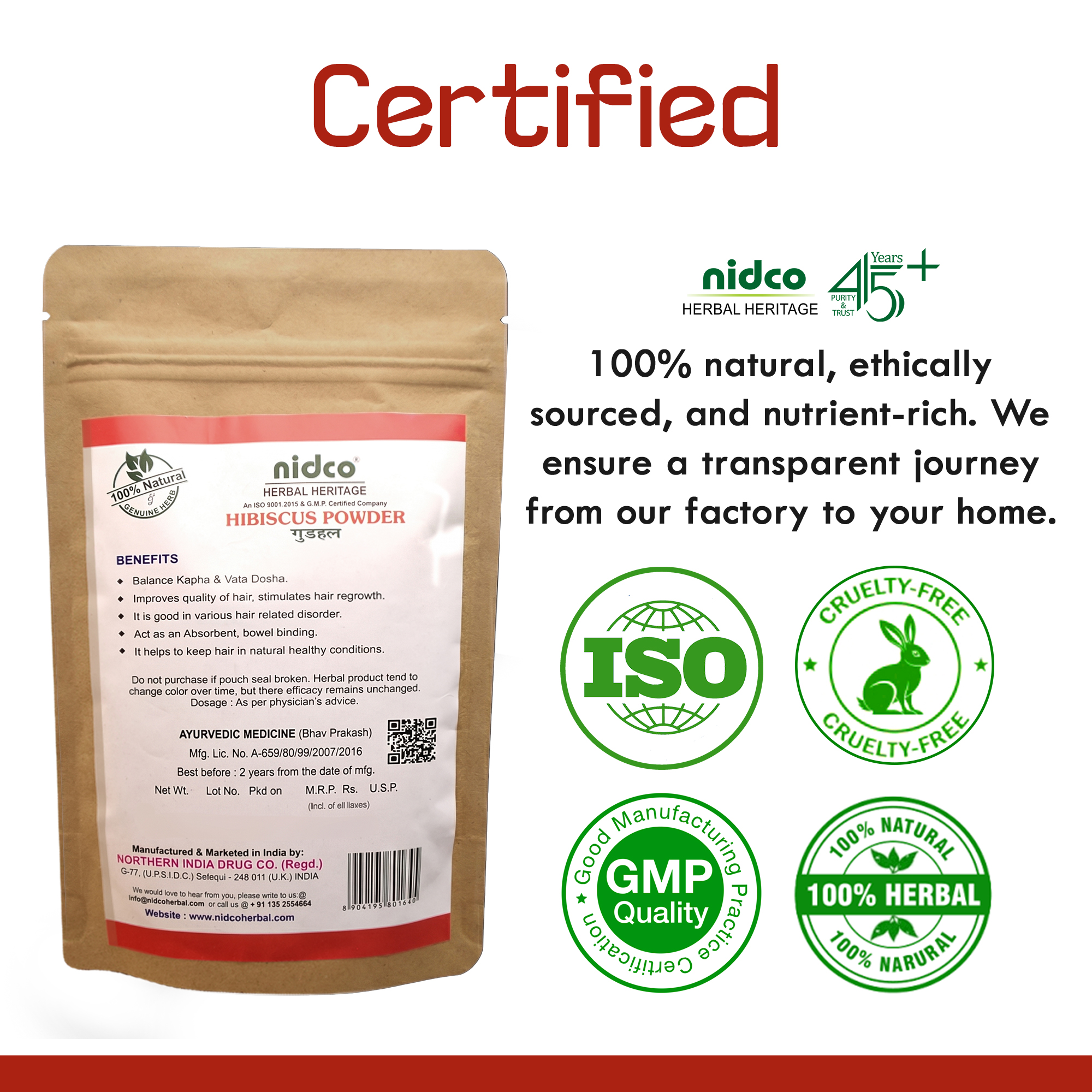 Unlock the natural beauty and health benefits of Hibiscus (Gudhal Phool) with Nidco’s pure herbal powder. Made from carefully selected Hibiscus Flowers, our powder is processed to retain its natural nutrients, making it ideal for use in skincare, hair care, or as a health supplement.