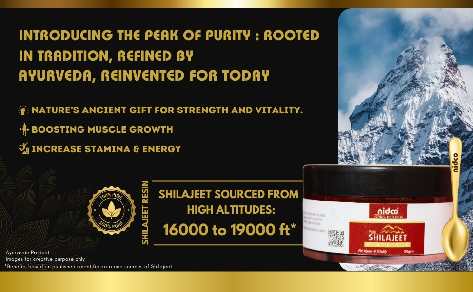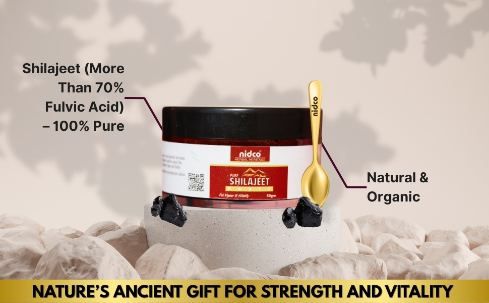 NIDCO Pure Shilajit Resin is a premium Ayurvedic supplement sourced from the Himalayan region. Rich in upto 71% fulvic acid and 85+ essential trace minerals, it traditionally supports energy, stamina and overall vitality. The resin form ensures higher purity and authenticity, helping promote strength, reduce fatigue and support daily wellness for both men and women.