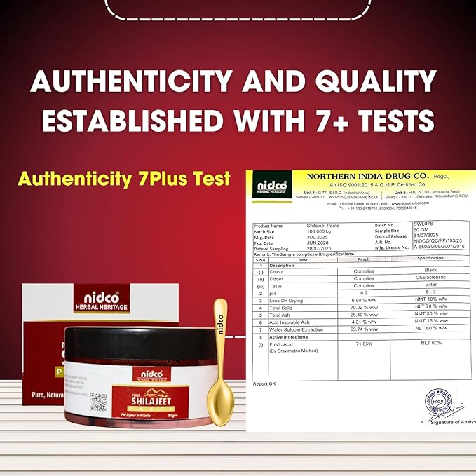 Experience the unmatched power of Nidco’s Pure Himalayan Shilajit Resin. Sourced directly from high-altitude regions and meticulously purified using a traditional, safe Ayurvedic process. Our raw mineral pitch is laboratory-tested to ensure authentic quality, potency, and freedom from heavy metals.