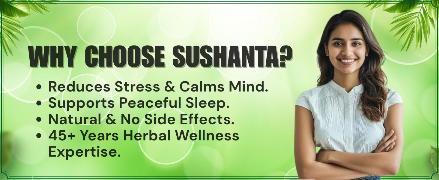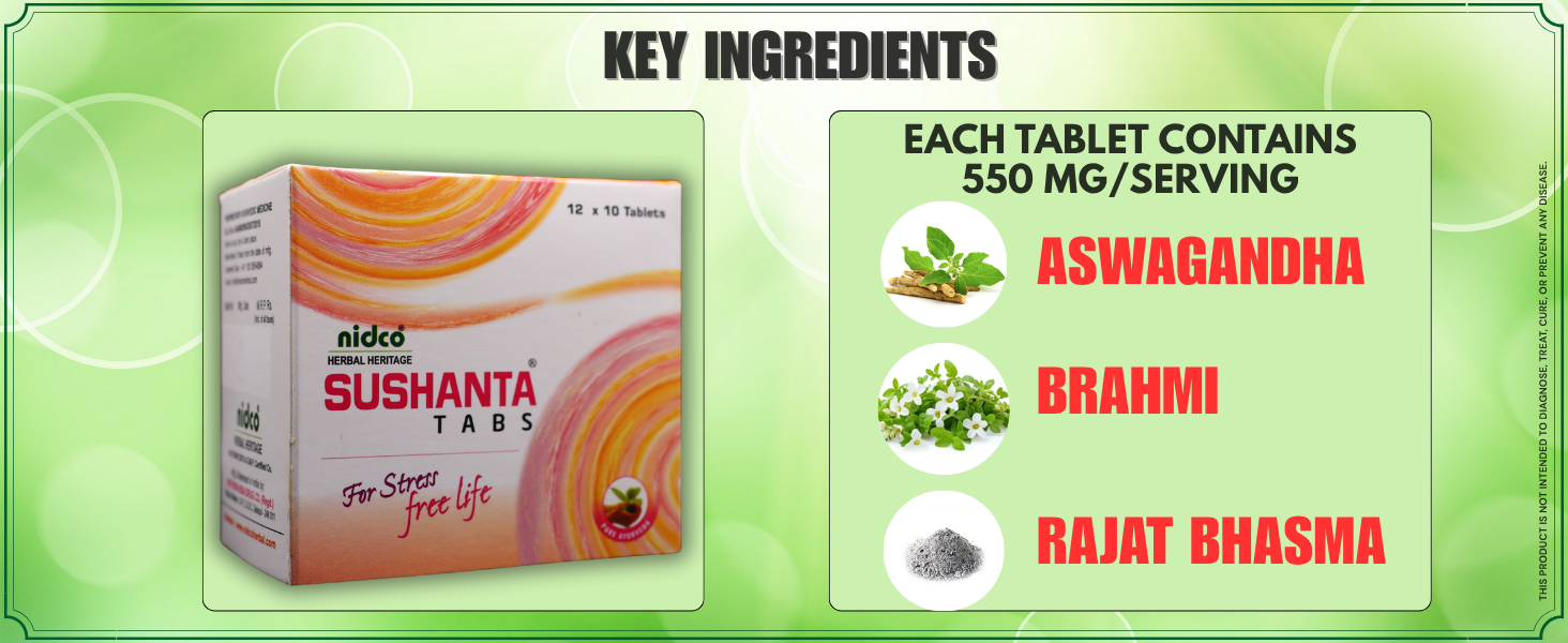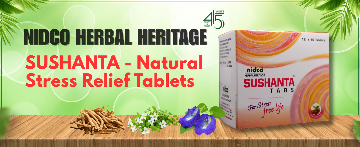 NIDCO Herbal Heritage Sushanta Stress Relief Tablets is a premium Ayurvedic formulation designed to support natural calmness, relaxation, and mental wellness. Enriched with powerful herbs like Ashwagandha, Brahmi, Rajat Bhasma and other traditional ingredients, this blend helps balance the nervous system and promotes a शांत (calm) and stress-free mind in today’s fast-paced lifestyle.