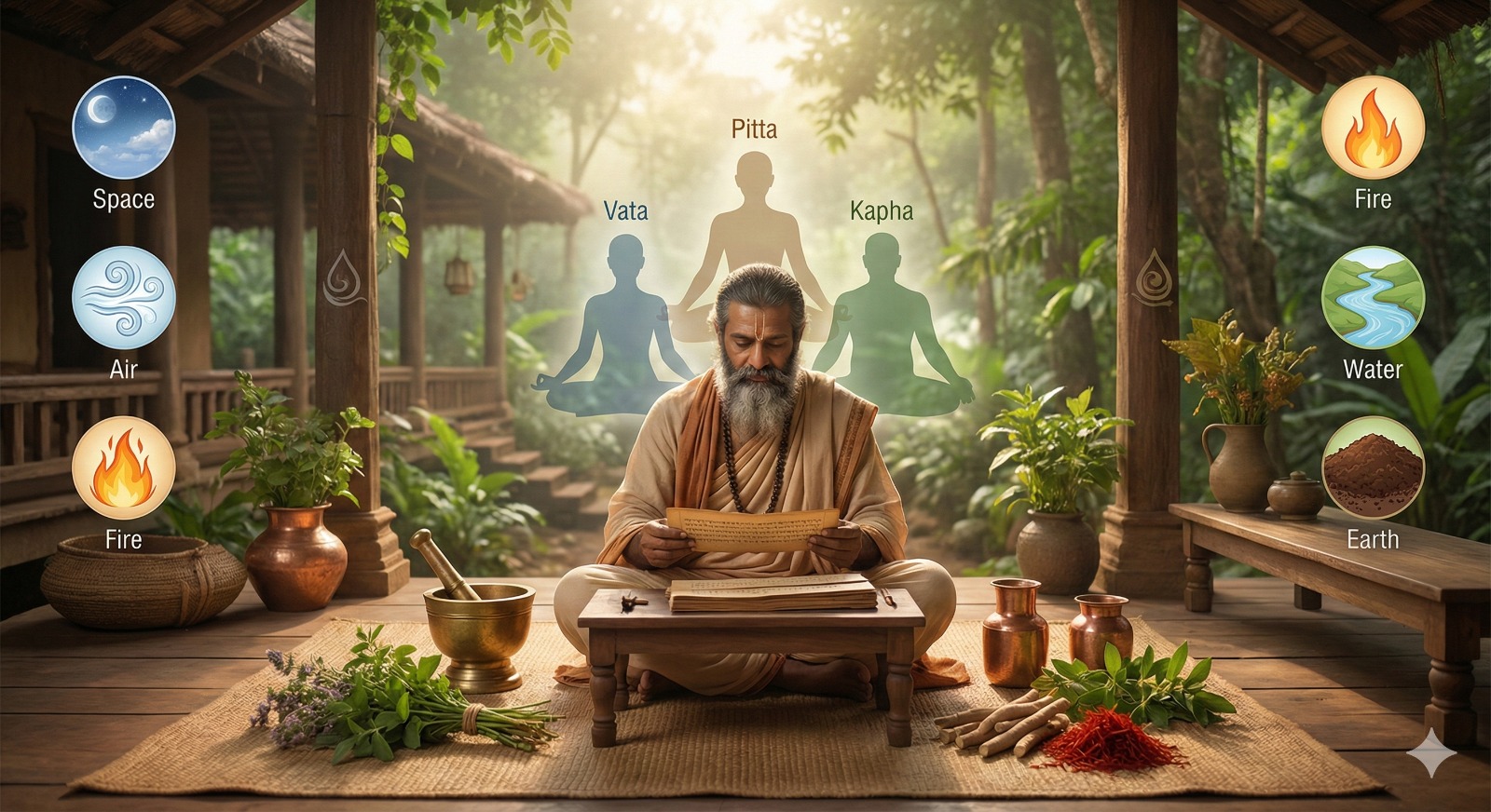 - Vata (Air + Space): Controls movement, circulation, and the nervous system.